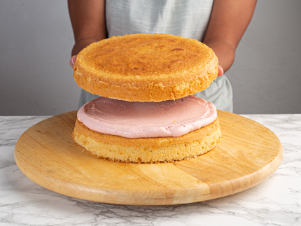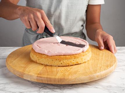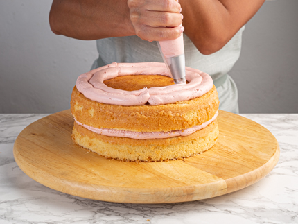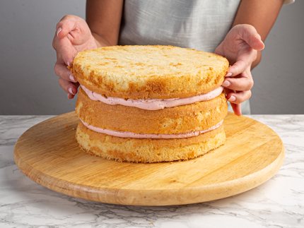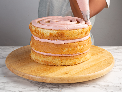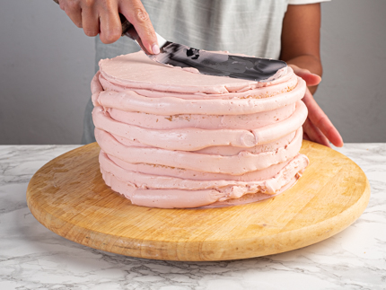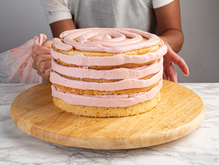 1. Place one of the bottom layers onto the cake stand or platter. Transfer 1/3rd of the buttercream into a piping bag fitted with a round tip. Pipe concentric circles onto the layer, and with a small offset spatula smooth out the buttercream. Place the matching top of the cake layer onto the buttercream, gently pressing down to adhere the layer onto the frosting.