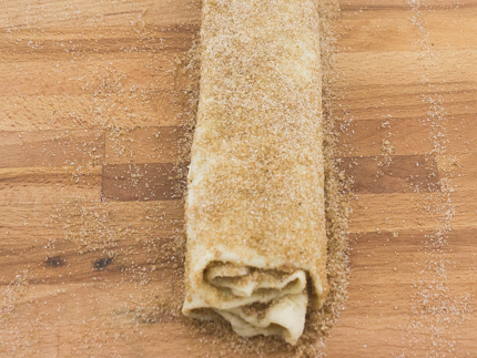 Lightly brush the top of the puff pastry with the remaining melted butter. Sprinkle the remaining sugar-spice mixture over the butter as evenly as possible, patting the sugar into the dough.