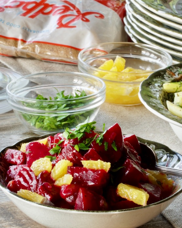 Add prepared beets to the skillet and heat through. Add half of the prepared oranges, toss or stir and season to taste with salt and pepper.