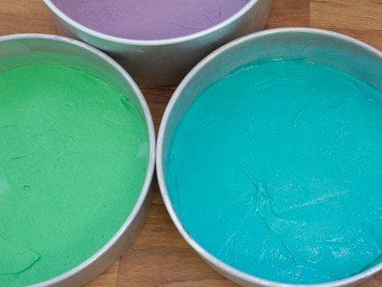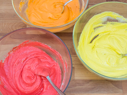 Scrape the remaining 3 colours of batter into the pans, smooth and bake as directed.