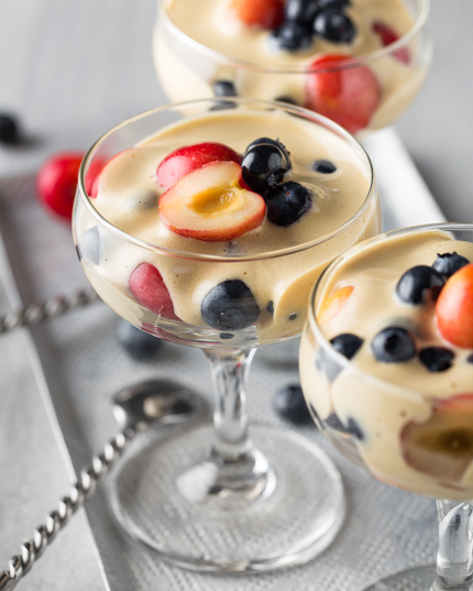 Zabaglione with Summer Fruits Zabaglione with Summer Fruits Zabaglione is an Italian favourite that comes in many forms, but we’ve decided to go with a custard-like version of this sweet treat. Served either chilled or warm, fresh fruit and just a bit of sweet wine make this grown-up dessert so irresistible, your inner child might convince you to lick the bowl! Categories: Puddings, Mousses & Custards Desserts Yields 8 servings Prep Time 5 minutes Cook Time 10 minutes Ingredients 1 ⅓ cup (353 g) fresh cherries, pitted and halved 1 ⅓ cup (345 g) fresh blueberries 6 tbsp (75 g) Redpath Granulated Sugar 6 large egg yolks ⅓ cup (80 ml) Marsala wine (another sweet dessert wine, such as Madeira or sweet sherry may be substituted) ¼ tsp (2 g) salt ¼ tsp (2.5 ml) almond extract Instructions In a bowl, toss together the cherries and blueberries. Divide fruit between 8 serving bowls, cover and set aside. Fill a medium pot with 2 inches (5 centimeters) of water and bring to a gentle simmer. Have ready a round bottomed, stainless steel or copper bowl that can rest on the top of the pot without touching the water. Off the heat, place the Redpath® Granulated Sugar, egg yolks, wine, and salt in the bowl. Immediately beat with an electric mixer or whisk until smooth. Set bowl over the simmering water and beat continuously, checking the water periodically to make sure it is not boiling. Beat mixture until it thickens to the consistency of soft whipped cream, and pools in ribbons when the beaters are lifted, about 10 minutes. Remove from heat and beat in almond extract Top prepared fruit with warm zabaglione. Serve immediately. CHEF'S TIPS For a nonalcoholic version, substitute white grape juice or apple juice for the wine Any other fresh, seasonal fruit may be substituted for the cherries or blueberries Zabaglione may be chilled before serving Puddings, Mousse & Custards Springtime Dirt Pudding Salted Dark Chocolate Crème Brûlée Sweet Golden Kugel Holiday Cranberry Cranachan Campfire Bananas Foster Piña Colada Layered Gelatin Dessert Vegan Chocolate Pudding Simple Ambrosia Salad Pumpkin Cheesecake Trifle with Brown Sugar Whipped Cream Strawberry Balsamic Fool